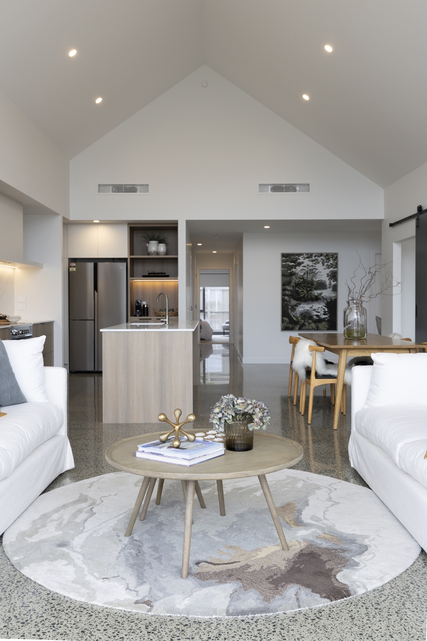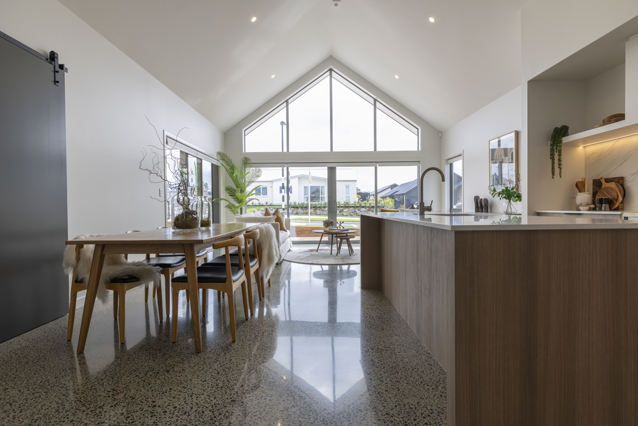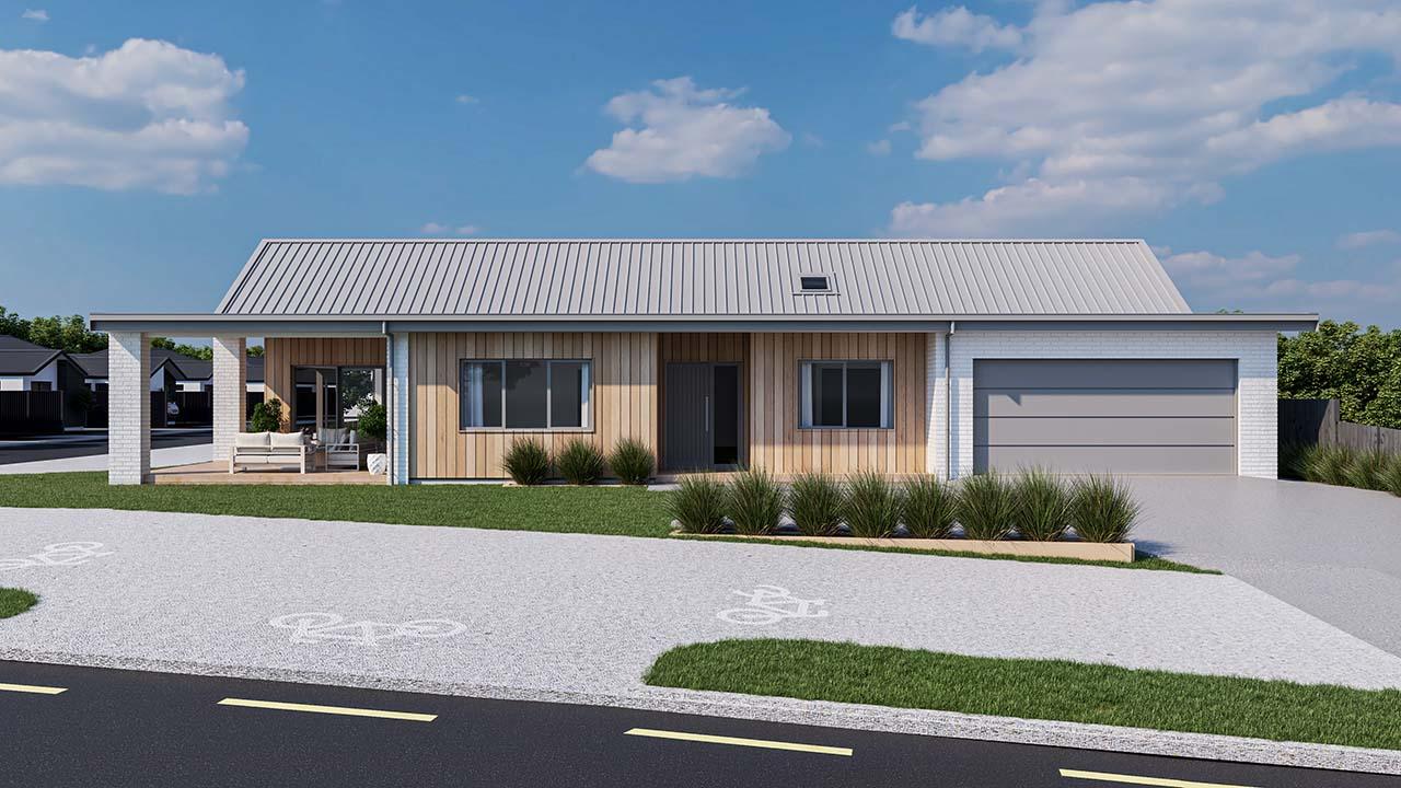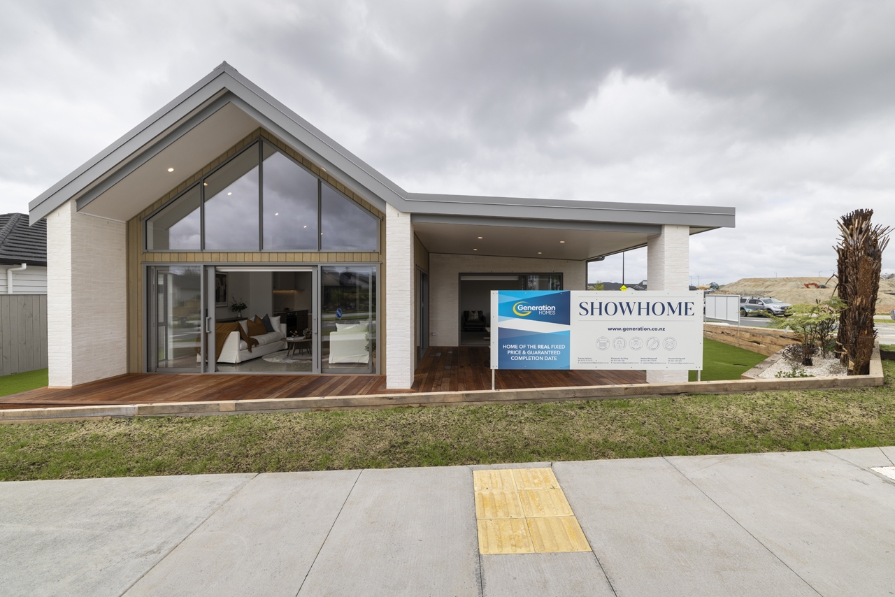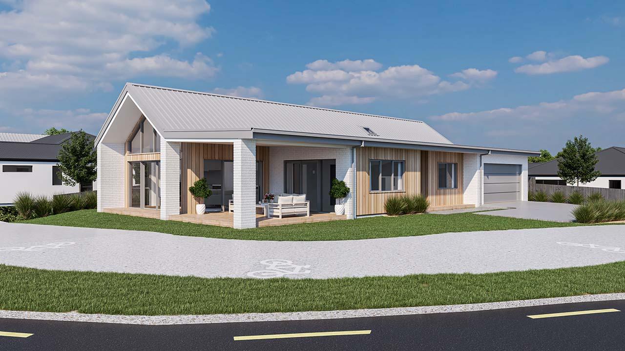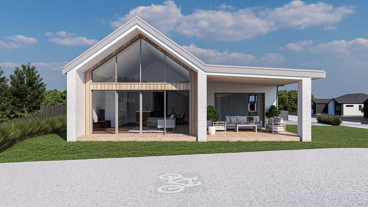 The Ōkura is an architecturally designed four-bedroom home featuring a spacious alfresco area, soaring cathedral ceilings in the open-plan living space, a private lounge, a gourmet kitchen with a walk-through pantry, polished concrete floors, and a striking brick exterior enhanced by stained timber accents.