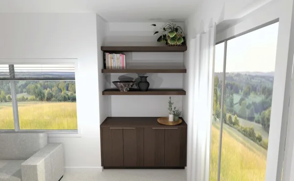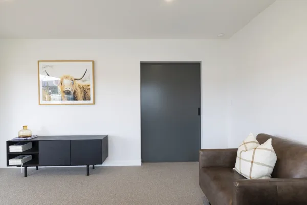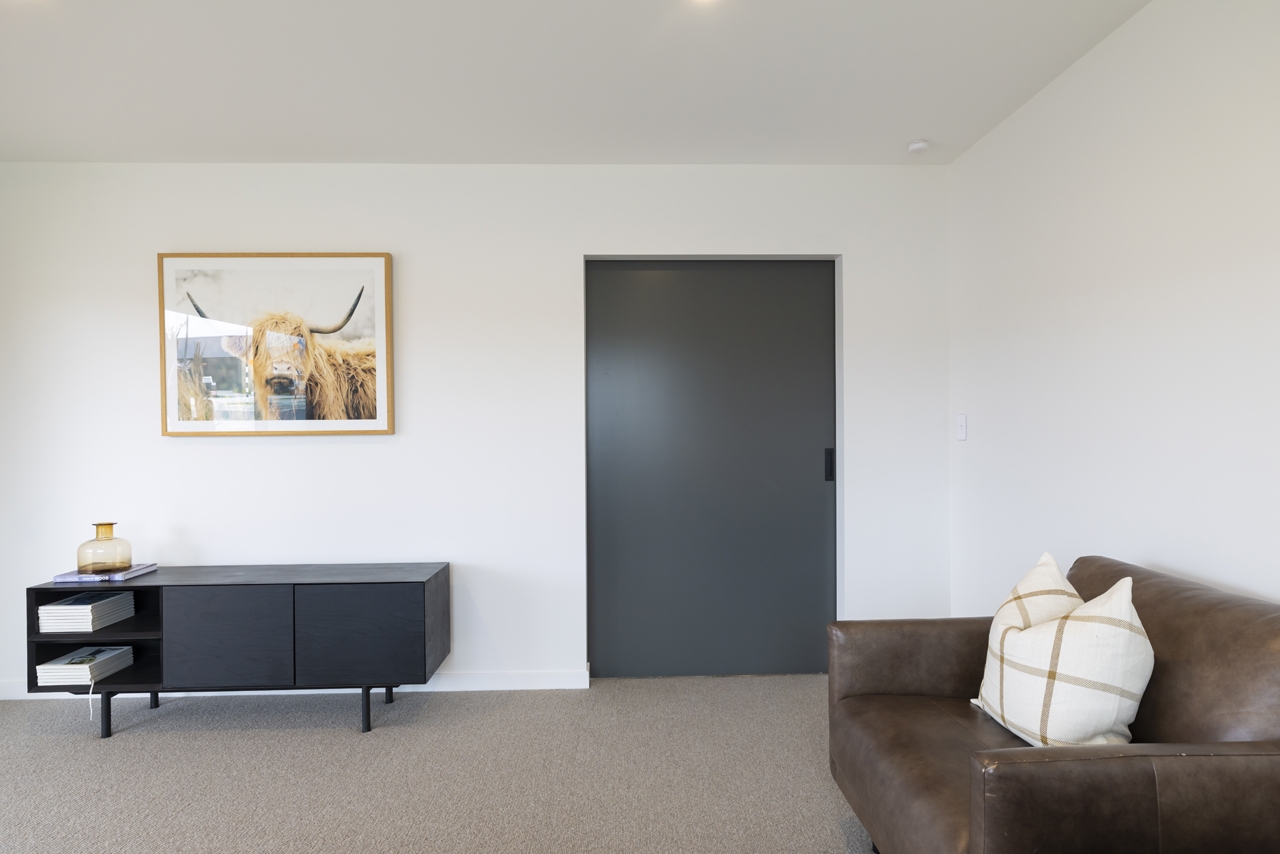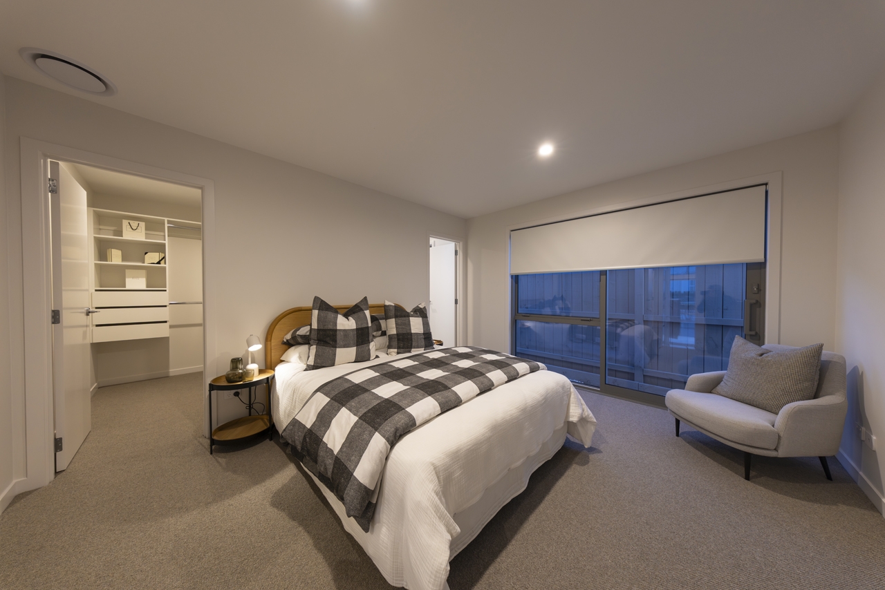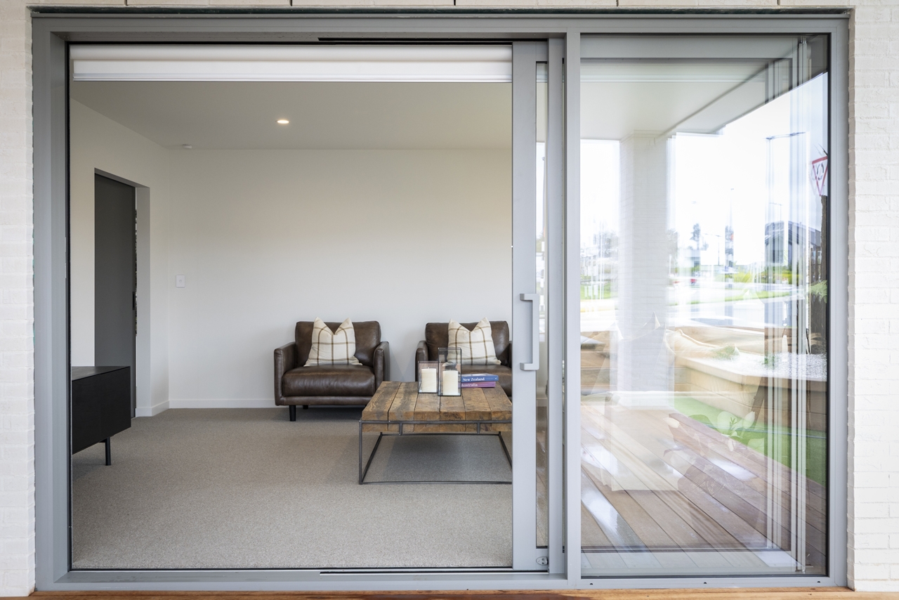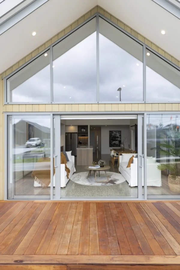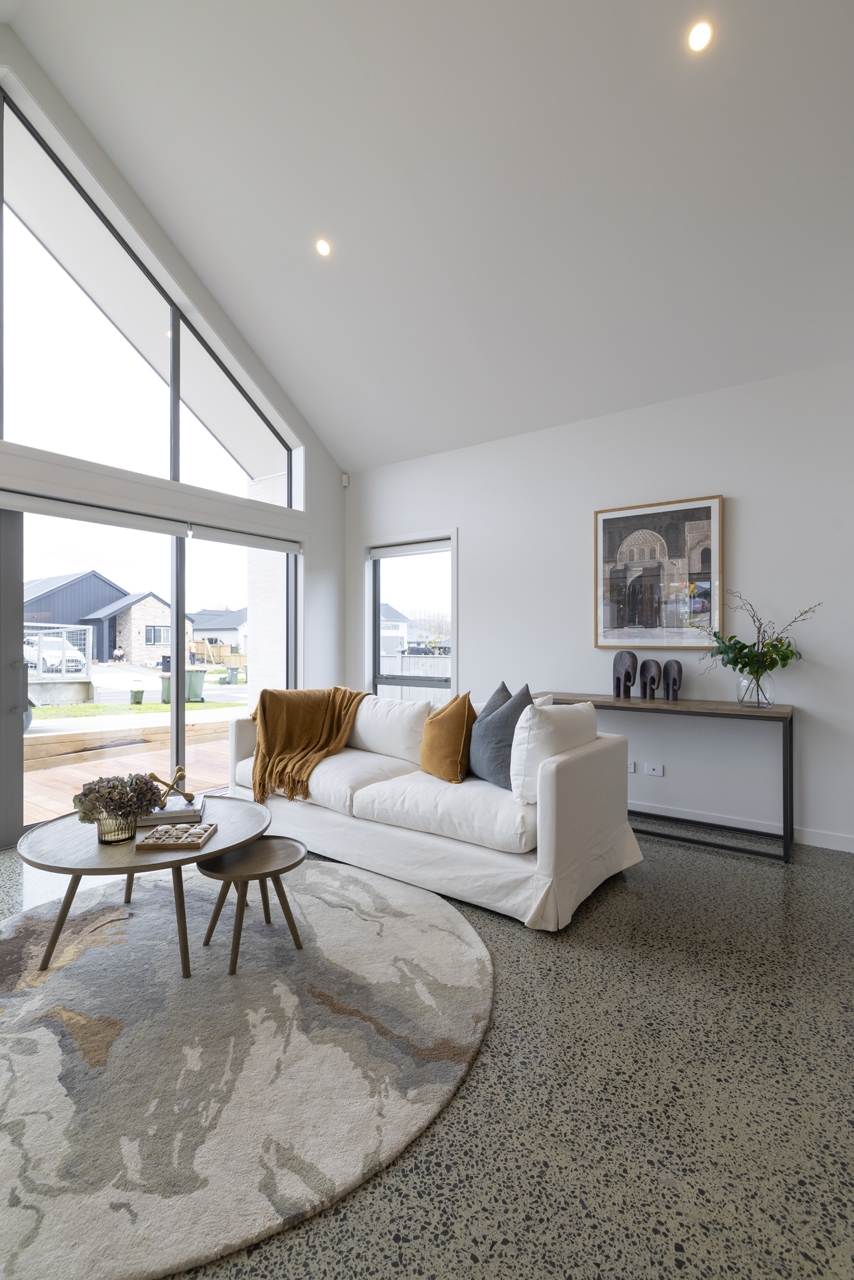 The Ōkura is an architecturally designed four-bedroom home featuring a spacious alfresco area, soaring cathedral ceilings in the open-plan living space, a private lounge, a gourmet kitchen with a walk-through pantry, polished concrete floors, and a striking brick exterior enhanced by stained timber accents.
