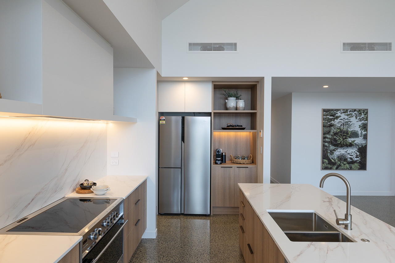 Gourmet kitchen with walk-through pantry leading to the separate laundry