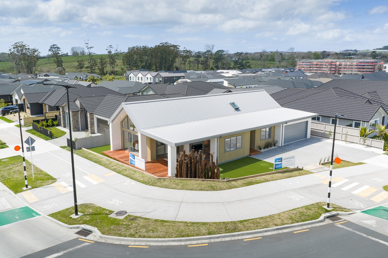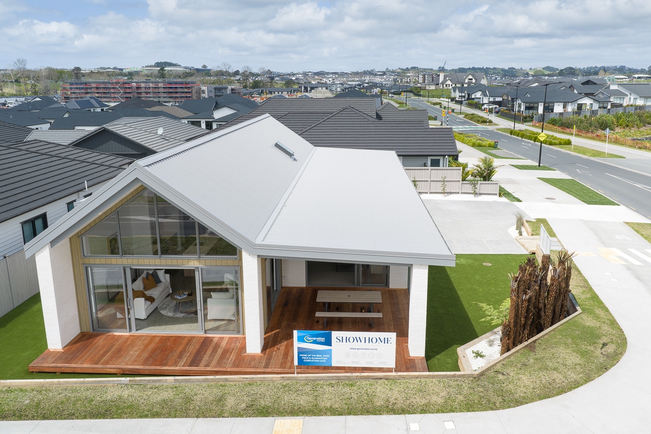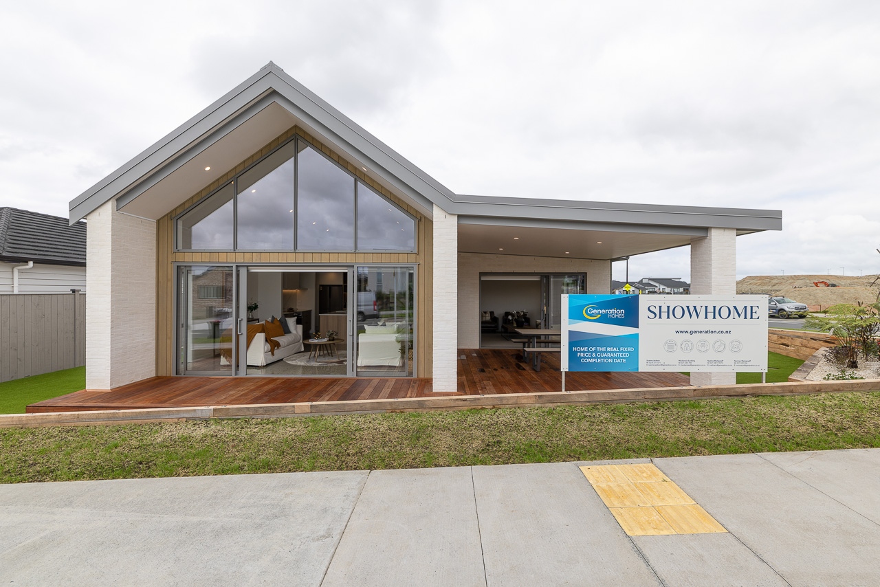 The Ōkura is an architecturally designed four-bedroom home featuring a spacious alfresco area, soaring cathedral ceilings in the open-plan living space, a private lounge, a gourmet kitchen with a walk-through pantry, polished concrete floors, and a striking brick exterior enhanced by stained timber accents.