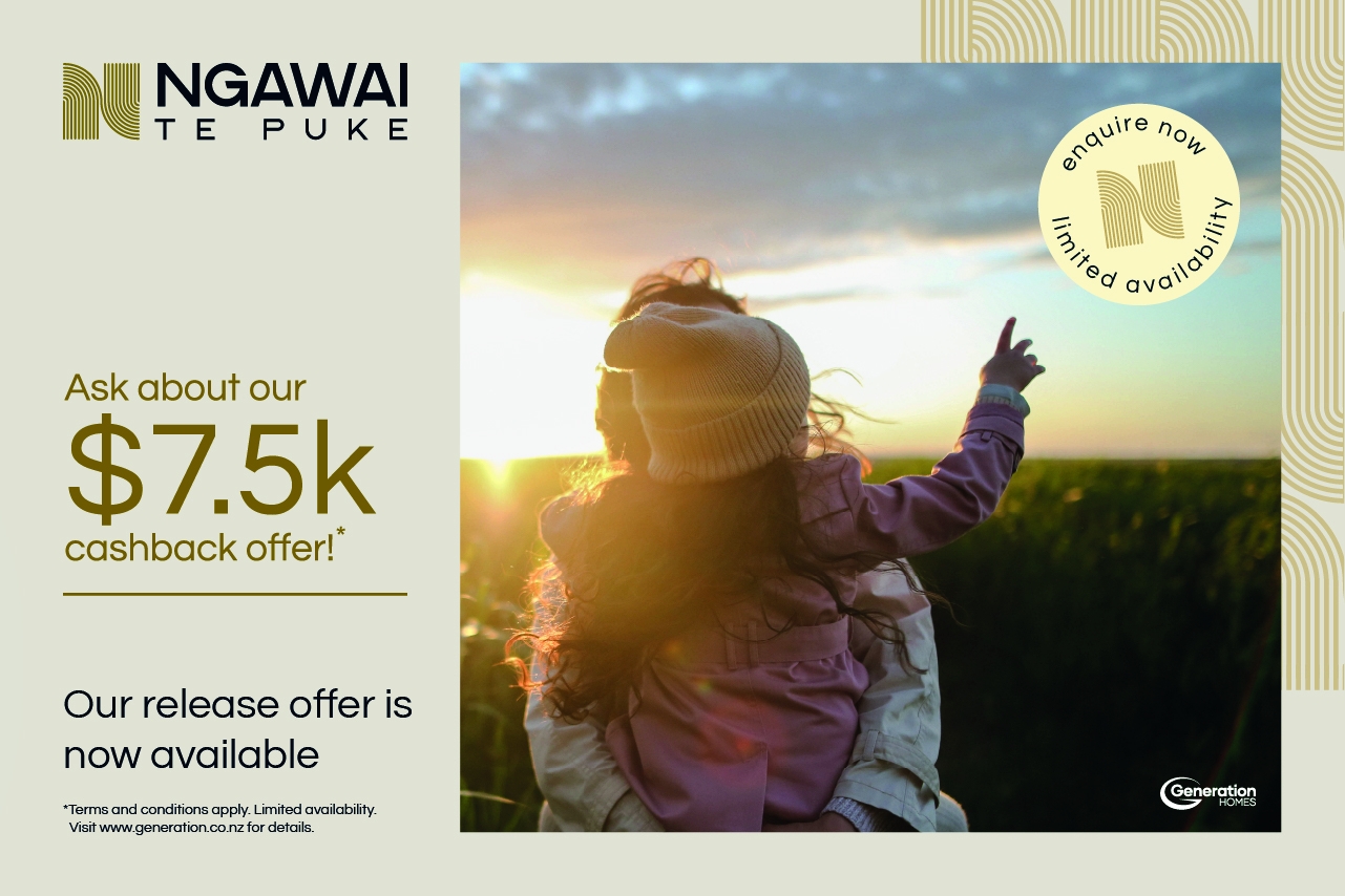 If you enter into an agreement to purchase house and land package with Generation Homes Bay of Plenty in Ngawai Te Puke from 23rd October 2025 and the agreement is unconditional on or before 12th December 2025, you will be eligible for a one-off cash-back payment of $7,500.00 (including GST) (Cash-Back Payment). If you wish to take up this offer to receive the Cash-Back Payment, simply let our Sales Consultant know and we will include it in your agreement.