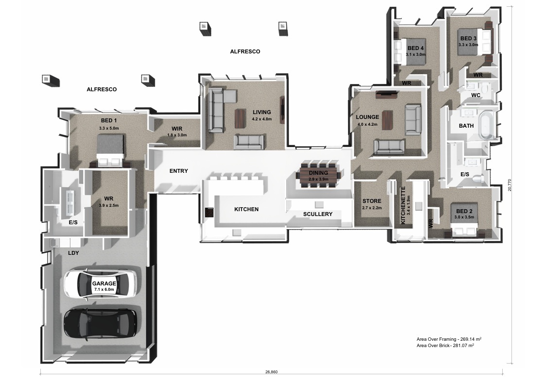 The home offers four well-proportioned bedrooms, with a standout master suite thoughtfully separated from the guest and family rooms. This private retreat provides peace, privacy and comfort, making it an ideal sanctuary at the end of the day, while the remaining bedrooms are perfectly placed for family, guests or home office flexibility. The plan also includes a kitchenette, offering a great option for intergenerational living or the potential for a home and income setup. Alternatively, this space can easily be adapted to suit your needs—whether that’s a fifth bedroom, home office, or additional living area.