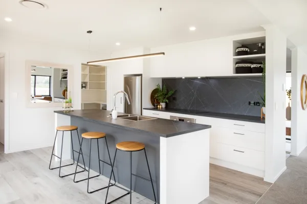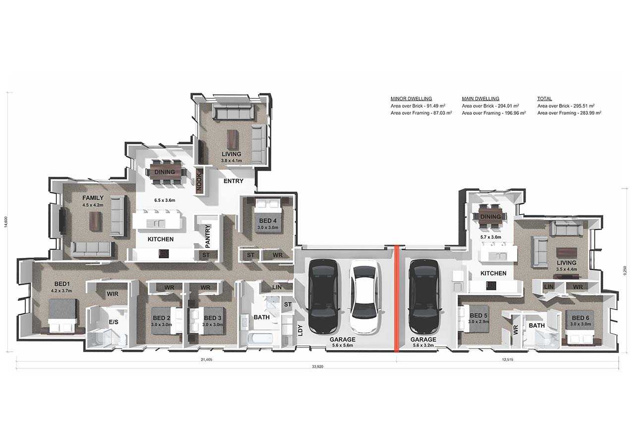 The Clarence Home & Income plan features a four-bedroom main dwelling with a master suite, modern galley kitchen with walk-in pantry, open-plan living, separate lounge, study nook, and double garage, plus a two-bedroom minor dwelling with its own kitchen, living area, bathroom, and single garage - ideal for extended family or rental income.