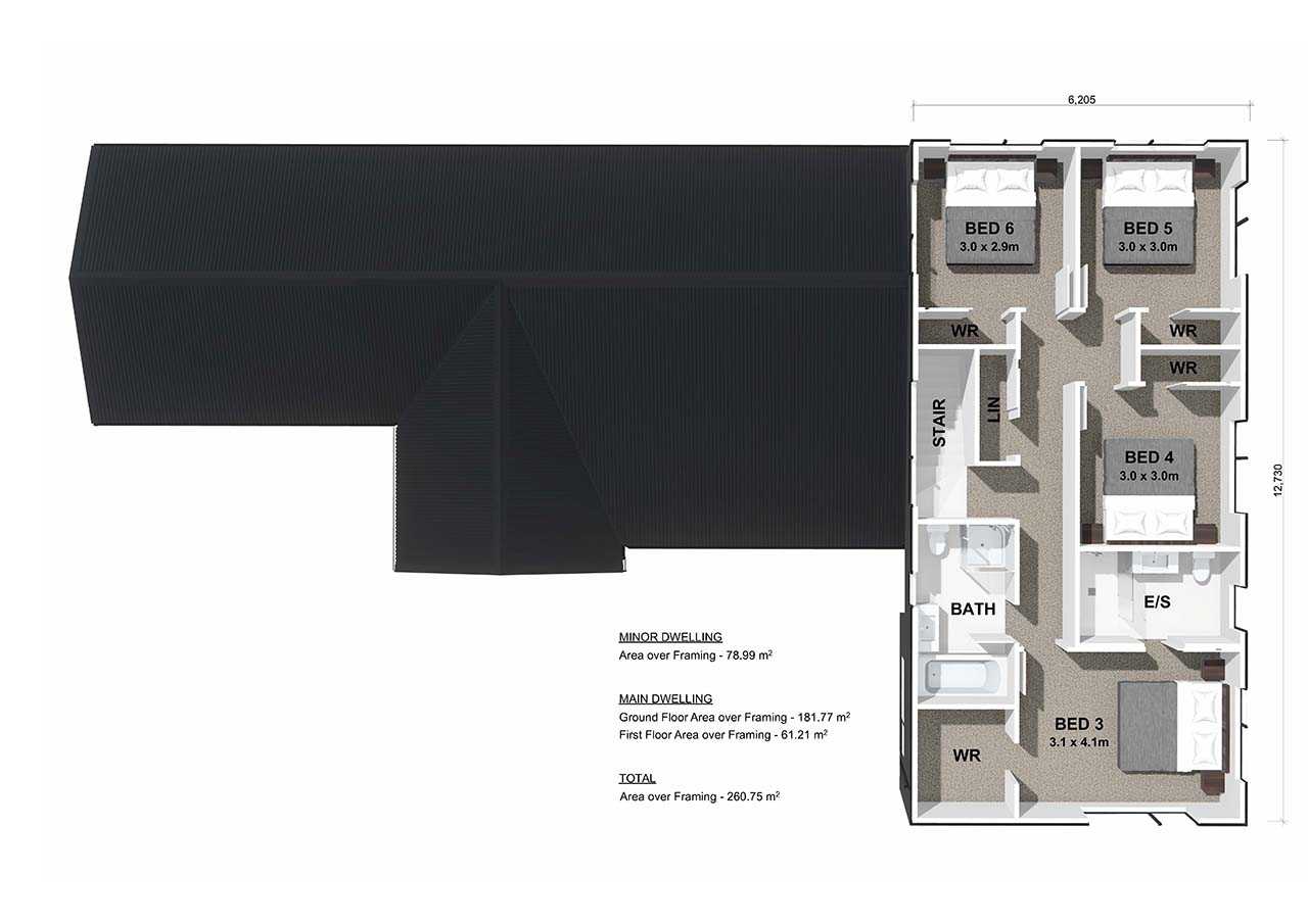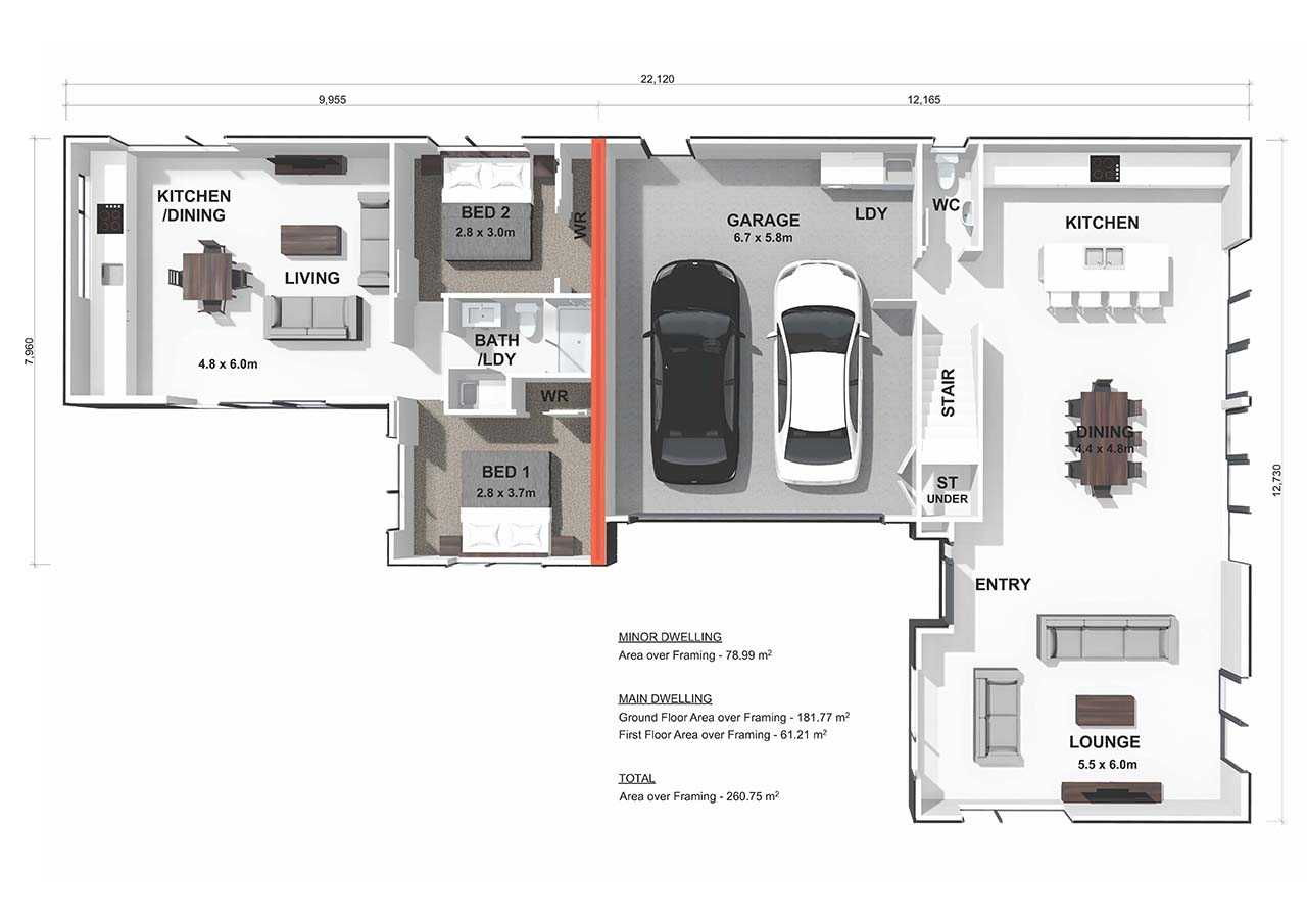 The Kaipara Home & Income plan features a four-bedroom main dwelling with a master suite, modern galley kitchen with scullery, open-plan living, storage under the stairs, and double garage, plus a two-bedroom minor dwelling with its own kitchen, living area, and bathroom - ideal for extended family or rental income.