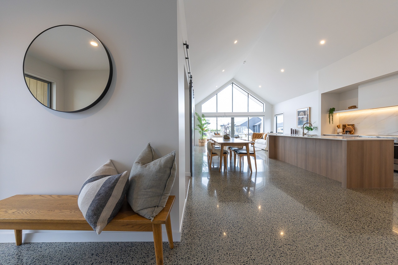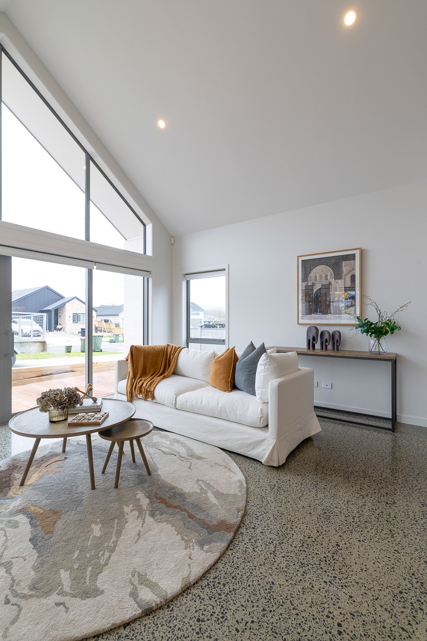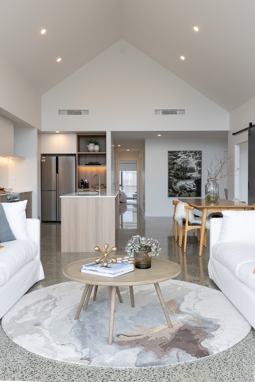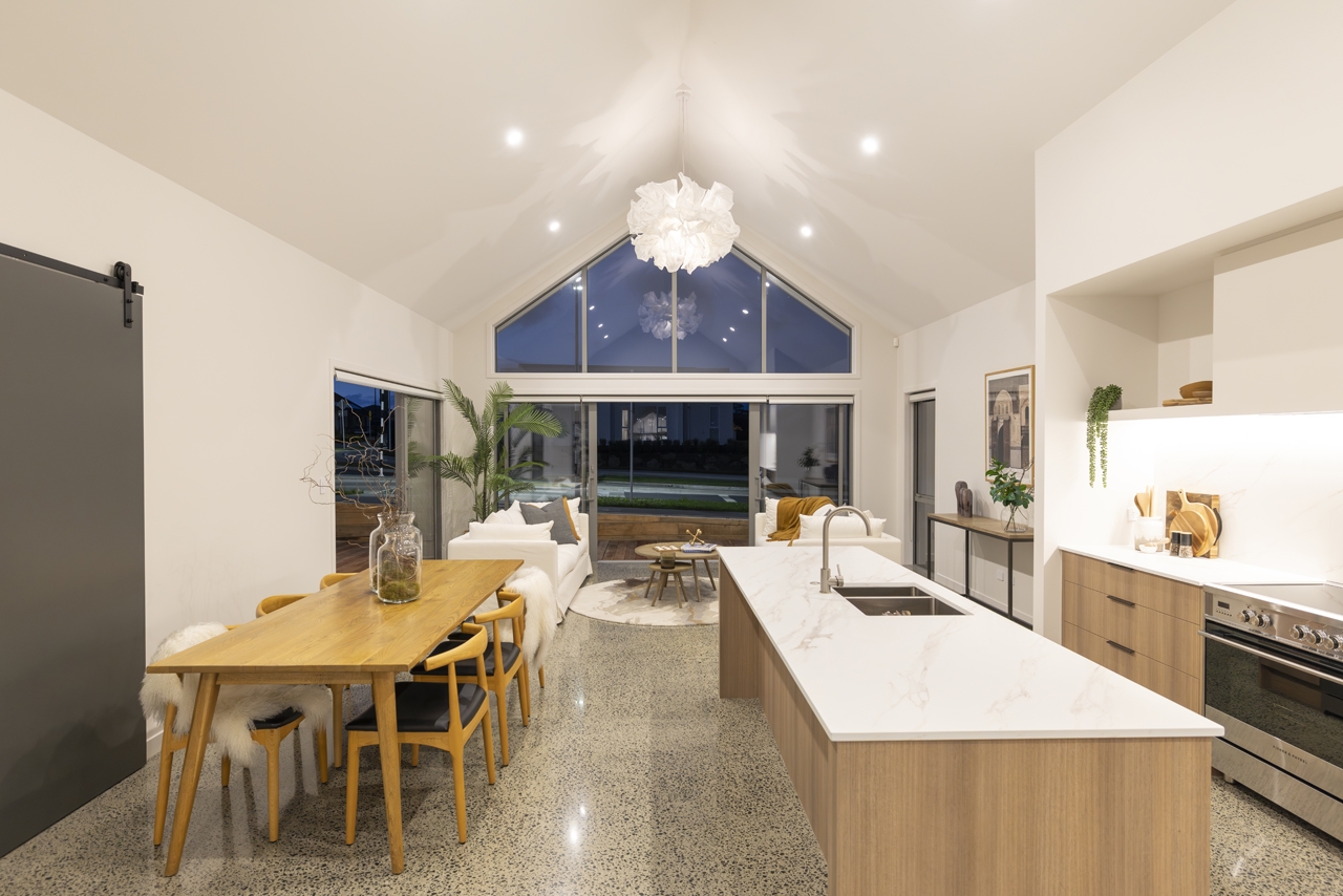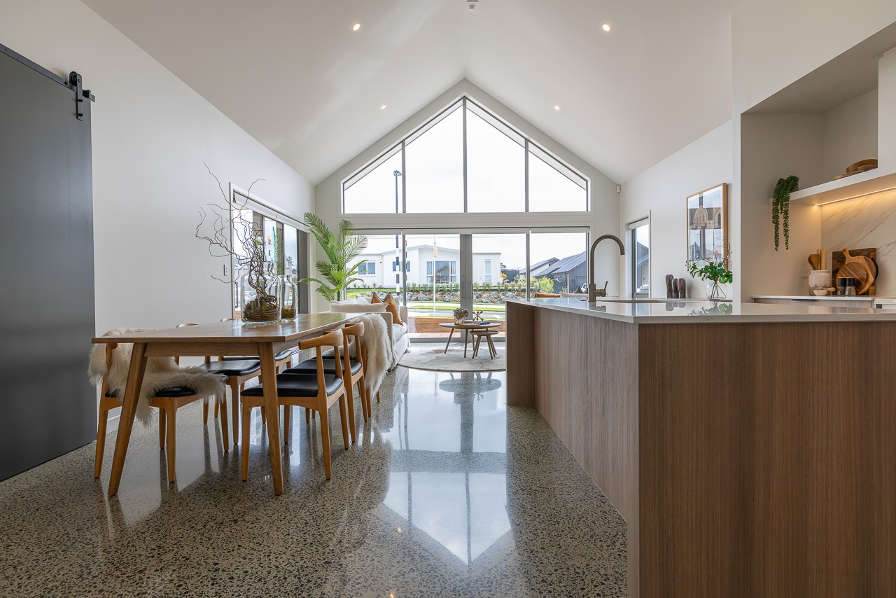 The Ōkura house plan features four spacious double bedrooms, two bathrooms, a separate lounge, and an open-plan living area with cathedral ceilings. At also has a gourmet kitchen with a walk-through pantry connects to a separate laundry.