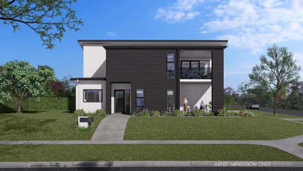 The Te Wai is a spacious two-level home with four double bedrooms, including a master suite with ensuite, walk-in wardrobe and balcony, plus an open-plan top level with a galley kitchen, large scullery, and alfresco deck.