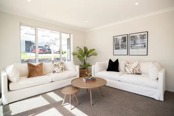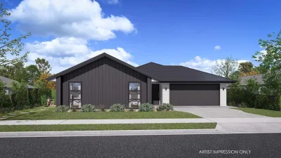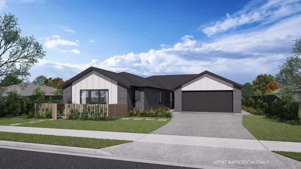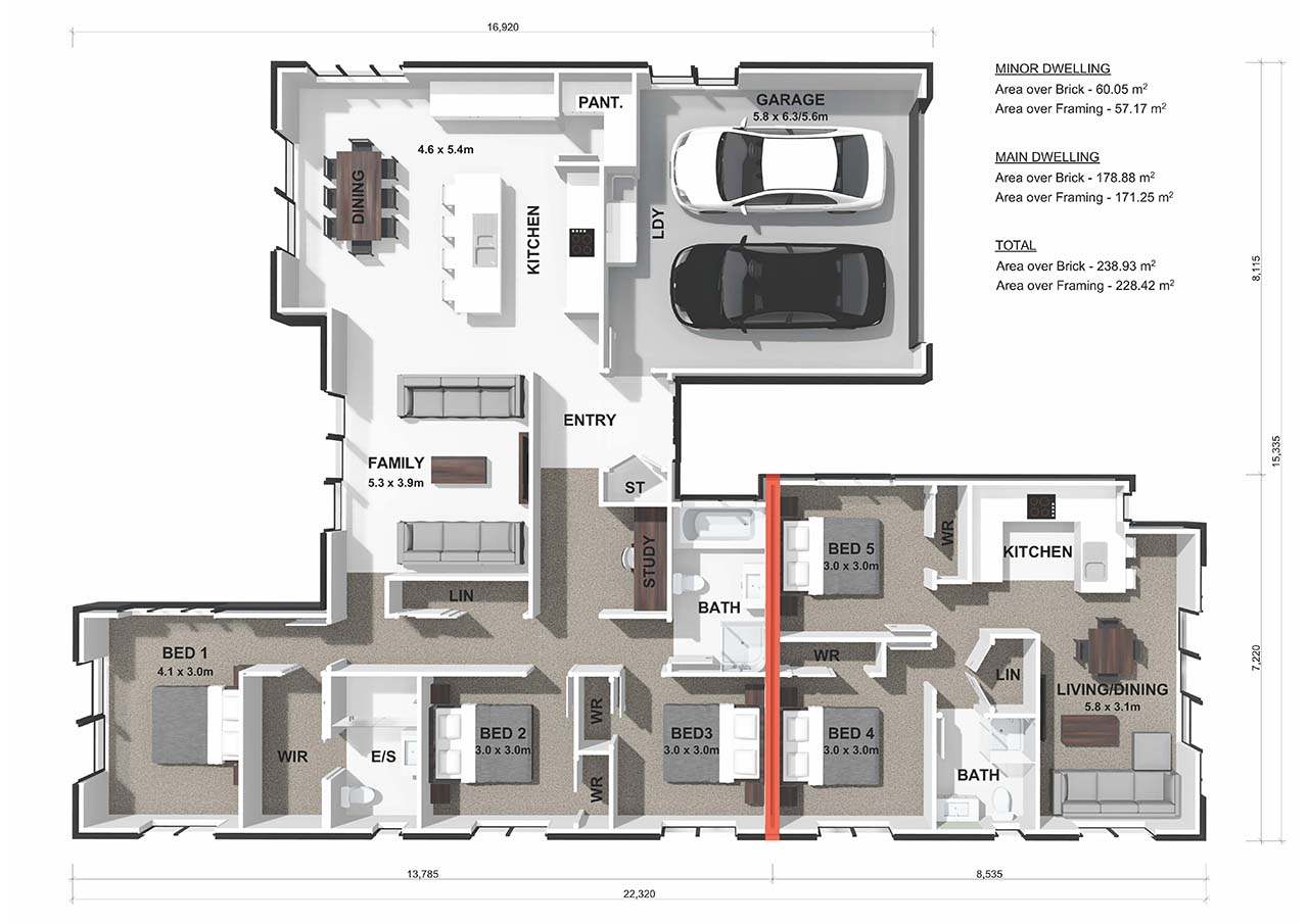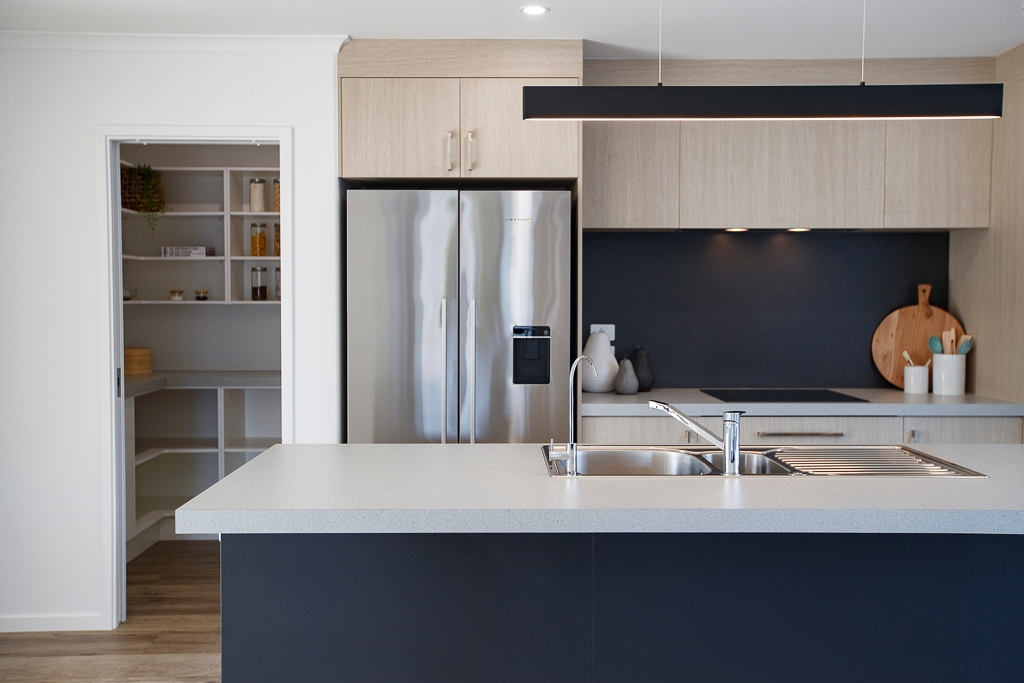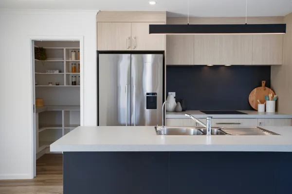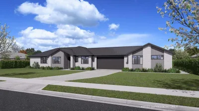 The Waimakariri Home & Income plan features a three-bedroom main dwelling with a master suite, modern galley kitchen with walk-in pantry, open-plan living, and study nook, plus a double garage. The two-bedroom minor dwelling includes its own kitchen, open-plan living, and bathroom - ideal for extended family or rental income.