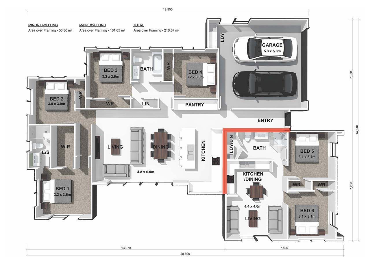 The Wairau Home & Income plan offers a four-bedroom main dwelling with a master suite, modern galley kitchen, and open-plan living, plus a two-bedroom minor dwelling with its own kitchen, living, and bathroom - perfect for extended family or rental income.