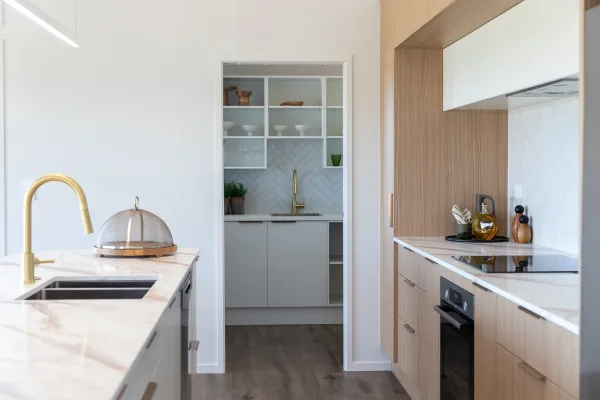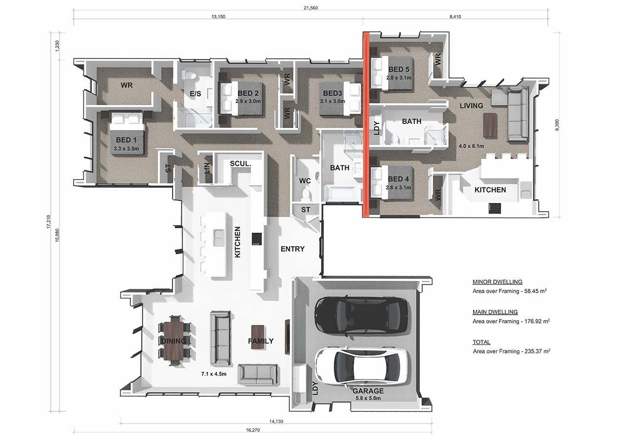 The Waiwera Home & Income plan features a spacious main dwelling with three double bedrooms, plus open-plan living, a modern galley kitchen with scullery, and a double garage. The minor dwelling offers two double bedrooms, kitchen with breakfast bar, and open-plan living - making it ideal for extended family or rental income.